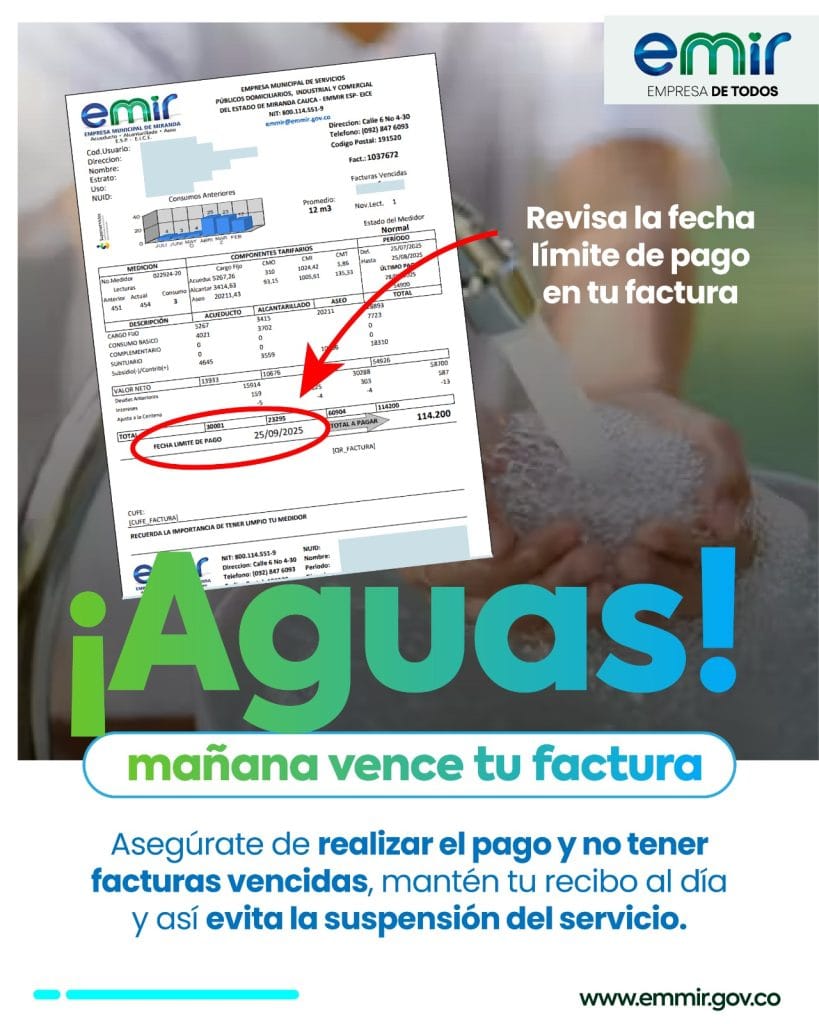 Revisa tu factura EMMIR, en la parte inferior derecha, asegúrate de realizar el pago oportunamente y no tener facturas vencidas.
