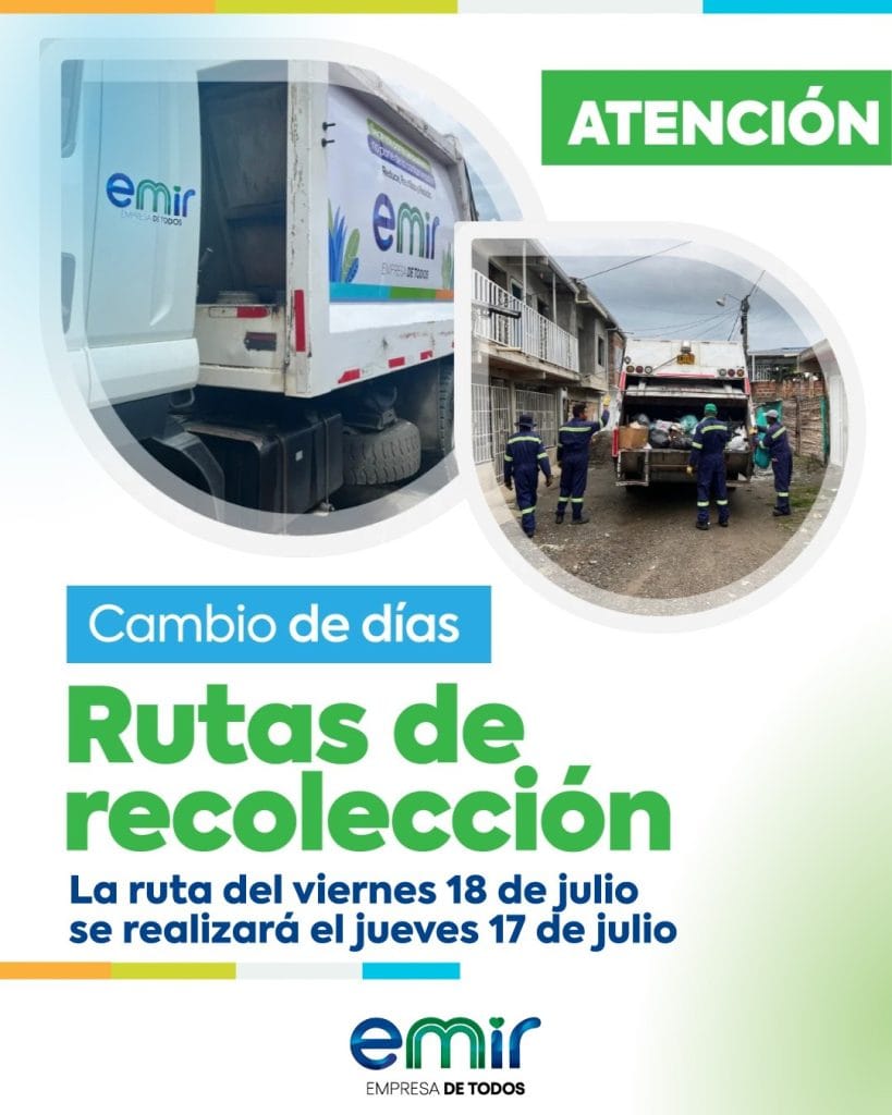 Este viernes 18 de julio habrá un cambio temporal en la recolección de basuras. La ruta recolectora habitual del día viernes se realizará el jueves 17 de julio. Por tal motivo, y en cumplimiento de nuestras funciones, se prestará el servicio de recolección en esa nueva fecha.