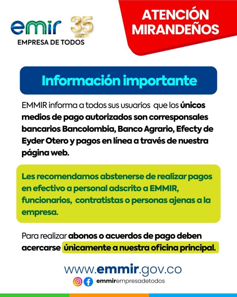Pagos en linea en nuestra pagina web www.emmir.gov.co