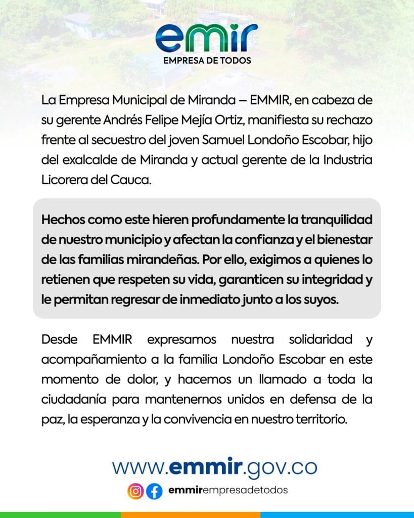 Con firme esperanza aguardamos el pronto regreso de su hijo, Samuel Londoño Escobar, alzando la voz por el respeto a su vida y deseando que vuelva sano y salvo a los brazos de su familia.