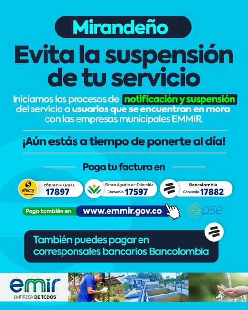 Si tienes una factura vencida o en mora, págala antes de la fecha de vencimiento y evita el pago por reconexión. En EMMIR te queremos ayudar a ponerte al día con tus facturas.