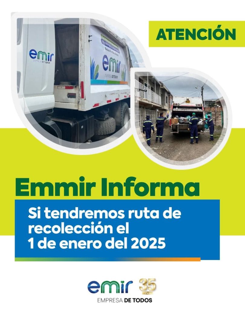 La Empresa Municipal de Miranda EMMIR, tiene la grata noticia de informar que prestaremos con total normalidad el servicio de recolección de basura el 1 de enero del 2025, iniciamos el año con la mejor disposición.
