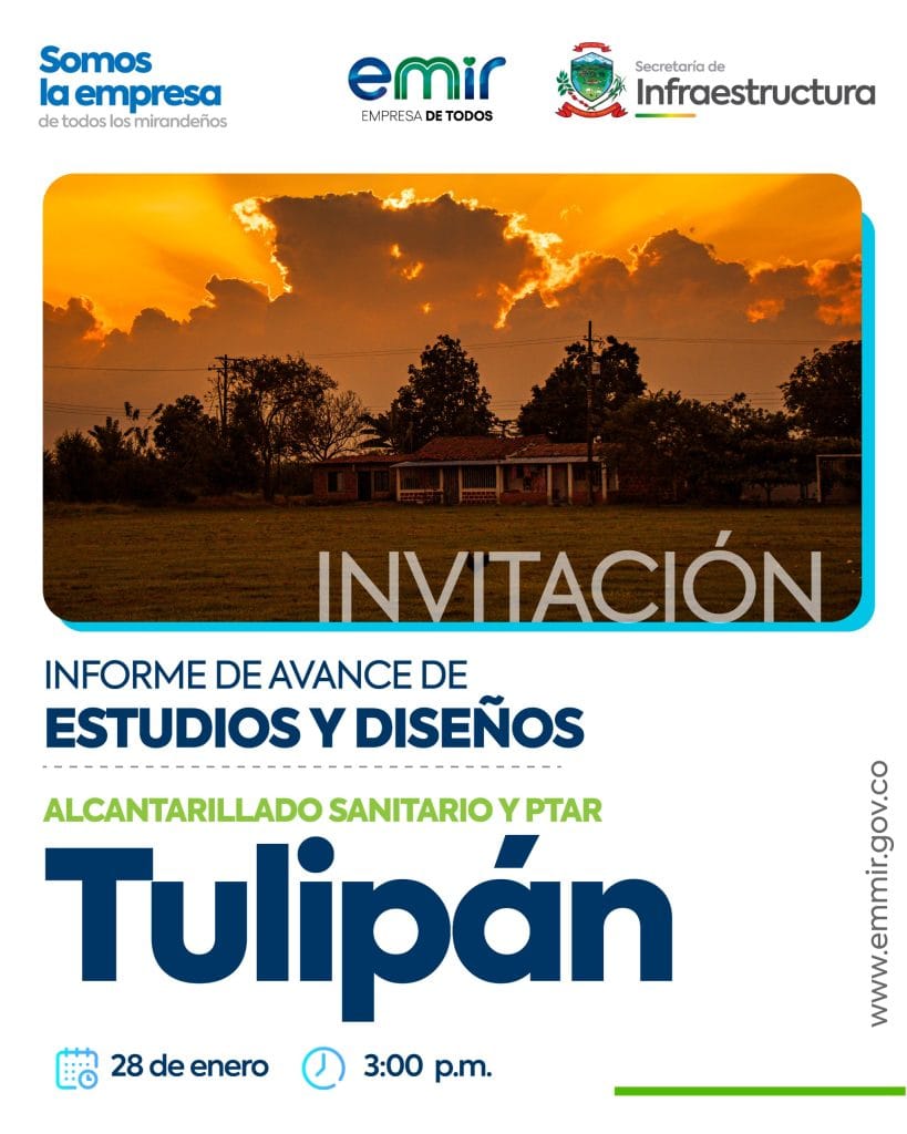 EMMIR, empresas públicas, en articulación con la Secretaría de Infraestructura de Miranda, invita a la ciudadanía de la vereda Tulipán a participar del Informe de Avance de Estudios y Diseños del proyecto de Alcantarillado Sanitario y PTAR.