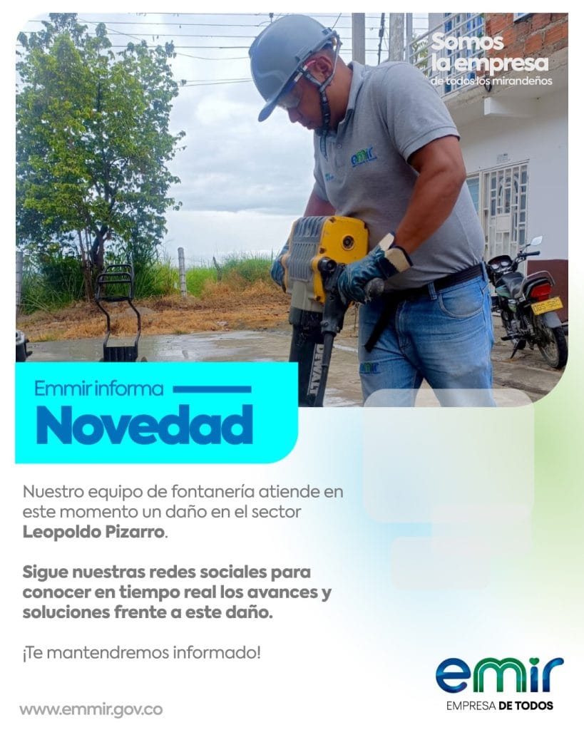 EMMIR E.S.P informa a la comunidad que en estos momentos nuestro equipo de fontanería atiende una avería en la tubería madre, ubicada en el barrio Leopoldo Pizarro (calle 5 con carrera 3).