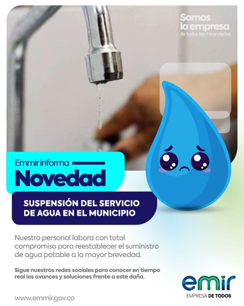 EMMIR informa a toda la comunidad que, debido a un taponamiento ocasionado por derrumbes en inmediaciones de la Bocatoma, será necesario realizar la suspensión temporal del servicio de agua potable.