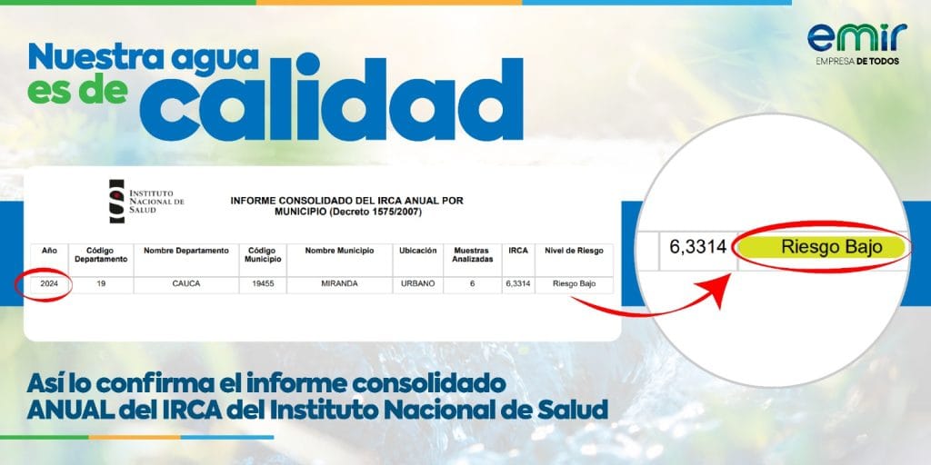 #Emmir se permite aclarar para la tranquilidad de los mirandeños sobre el falso dato difundido en una red social que de acuerdo al informe consolidado del Instituto Nacional de Salud, el agua que consumen los mirandeños es de calidad.